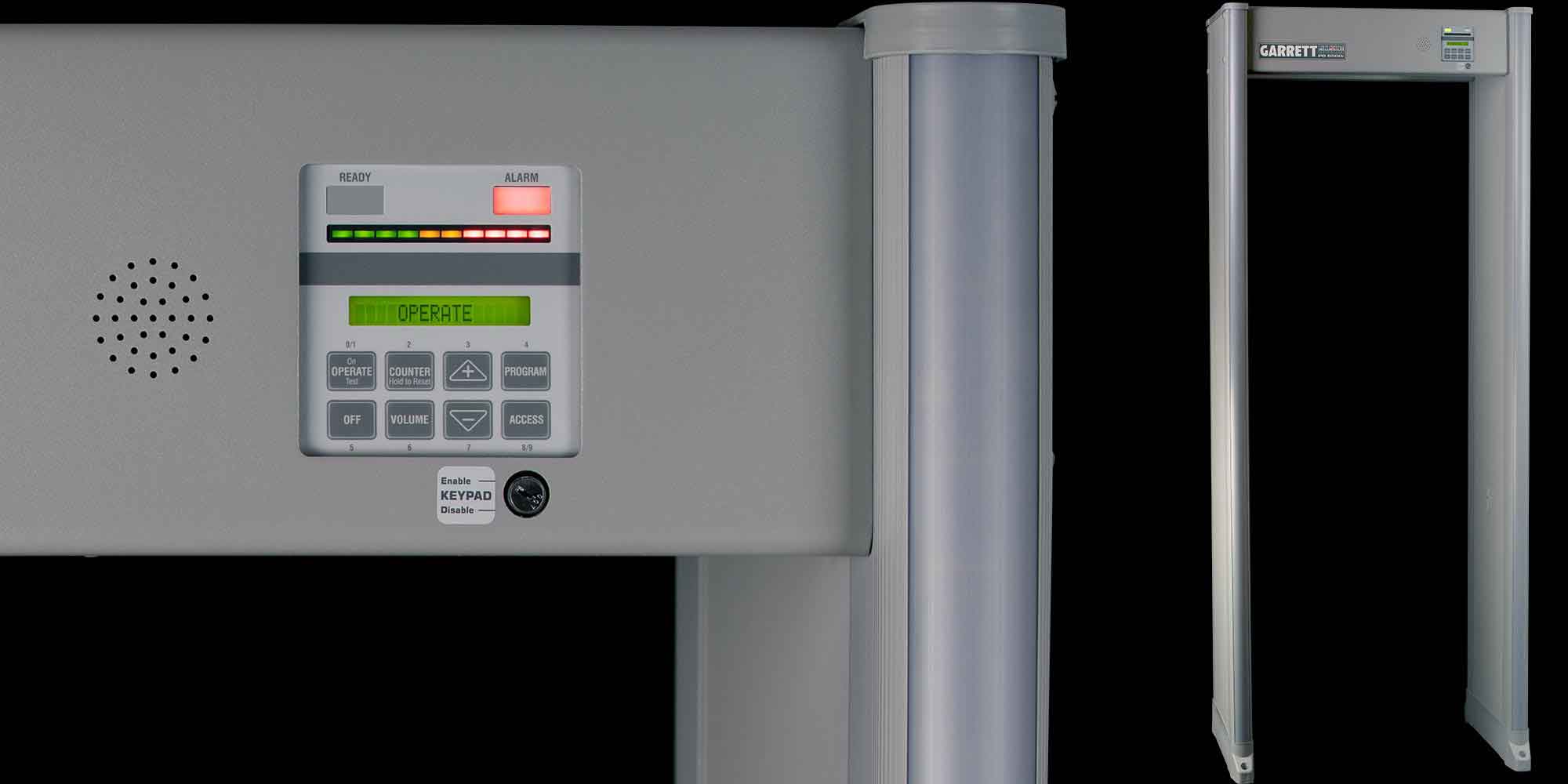 من لوحة تحكم جهاز كشف Garrett والمنبه يحذر المشغل عندما تكون البطاريات منخفضة.